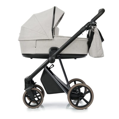 Lekki aluminiowy stelaż, komfortowe zawieszenie. Amortyzator z dwustopniową regulacją twardości, spora rozpiętość regulacji sprawia, że wózek dostosowany jest dobrze do bezdroży jak i gładkich powierzchni. Przednie koła obrotowe z możliwością blokady, system Anti Shock, system stabilizacji kół obrotowych. Bezobsługowe, bezdętkowe koła zapewniają płynne prowadzenie. Centralny hamulec. Szybki i prosty system składania ramy do małych rozmiarów. Możliwość zdjęcia kół z osią, co redukuje szerokość stelaża po złożeniu. Kosz na zakupy z możliwością powiększenia, z szybkim i łatwym dostępem do wnętrza dzięki zapięciom na magnes. Regulowana rączka obszyta eko-skórą. Łatwy i wygodny system „Click” przy montażu gondoli, spacerówki i fotelika. Gondola o ergonomicznych kształtach, składana na płasko, co znacznie ułatwia transport czy przechowywanie. Innowacyjny system szybkiego składania gondoli. Osłonka na nóżki z okienkiem oraz magnesami ułatwiającymi użytkowanie.