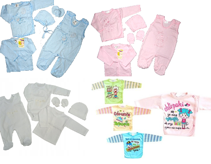 - Wyprawka niemowlęca (śpioch, kaftanik, niedrapki, czapeczka, koszulka)