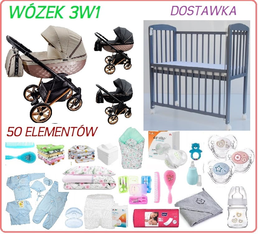 SKŁAD MEGA WYPRAWKI Z DOSTAWKĄ: ponad 50el (wózek 3w1, kołyska, zestaw pościelowy akcesoria dla mamy i dziecka,ubranka)