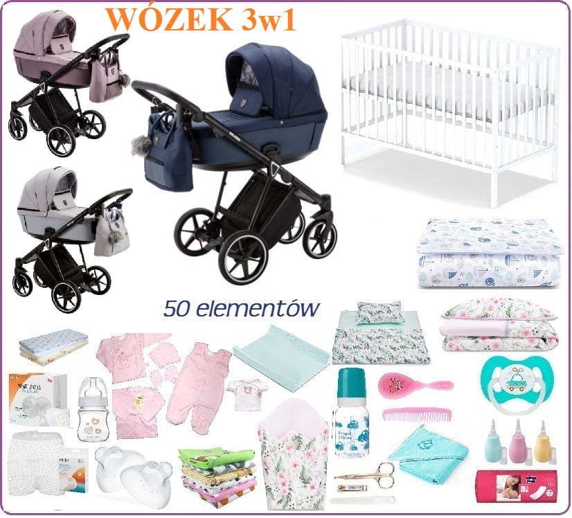 SKŁAD MEGA WYPRAWKI: ponad 50el (wózek 3w1, zestaw łóżeczkowy, akcesoria dla mamy i dziecka,ubranka)