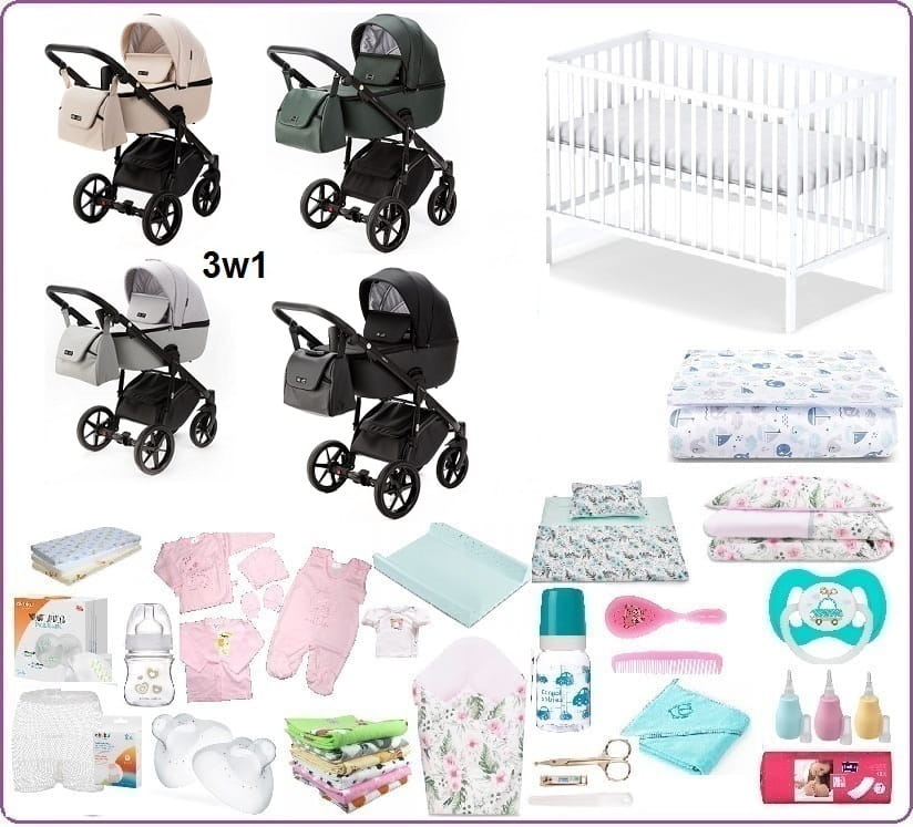 SKŁAD MEGA WYPRAWKI: ponad 50el (wózek 3w1, zestaw łóżeczkowy, akcesoria dla mamy i dziecka,ubranka)