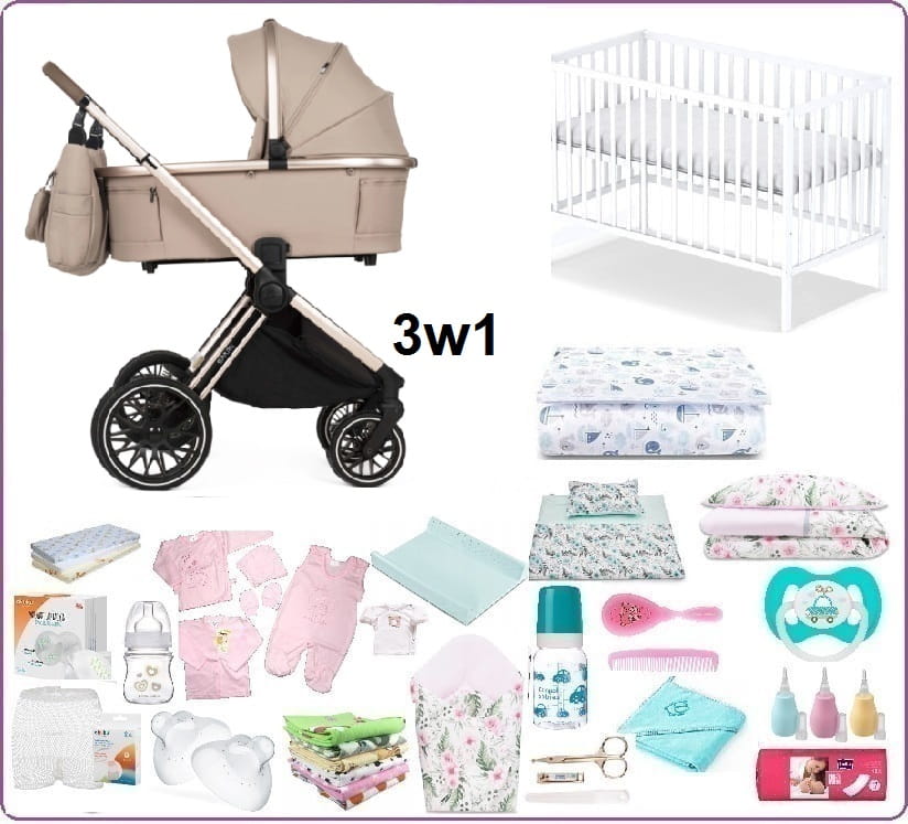 SKŁAD MEGA WYPRAWKI: ponad 50el (wózek 3w1, zestaw łóżeczkowy, akcesoria dla mamy i dziecka,ubranka)