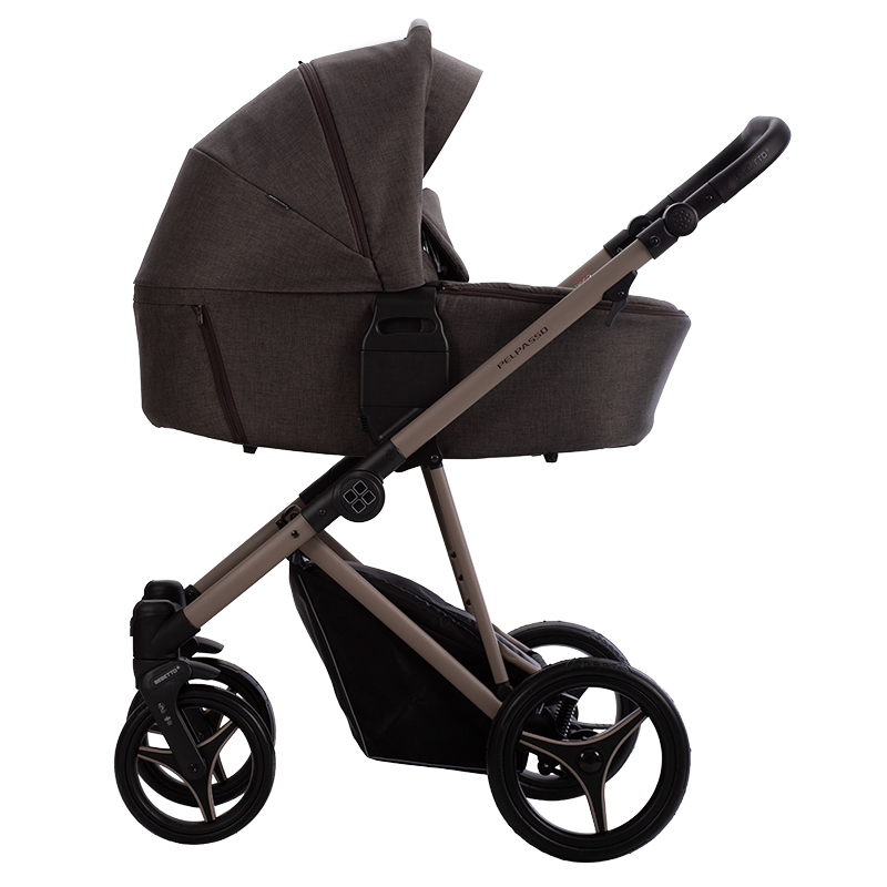 Bebetto Pelpasso jest dostępny w wersji PRO lub standardowej - wersja PRO charakteryzuje się tapicerką z ekoskóry. Wersja standardowa natomiast posiada tapicerki z materiału. Istnieją również dwa stelaże: w kolorze Choco lub Kaszmir.