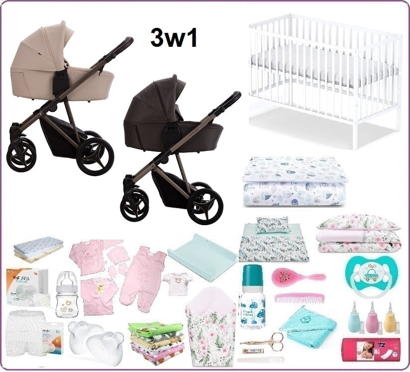 SKŁAD MEGA WYPRAWKI: ponad 50el (wózek 3w1, zestaw łóżeczkowy, akcesoria dla mamy i dziecka,ubranka)