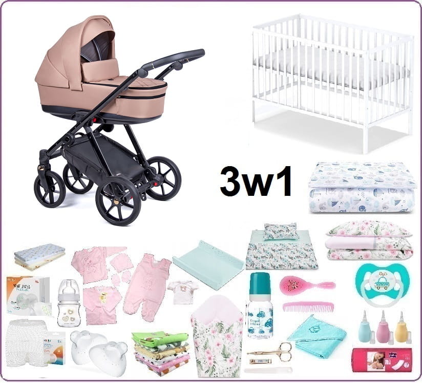 SKŁAD MEGA WYPRAWKI: ponad 50el (wózek 3w1, zestaw łóżeczkowy, akcesoria dla mamy i dziecka,ubranka)