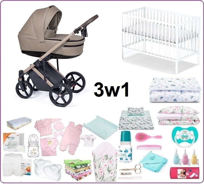 SKŁAD MEGA WYPRAWKI: ponad 50el (wózek 3w1, zestaw łóżeczkowy, akcesoria dla mamy i dziecka,ubranka)