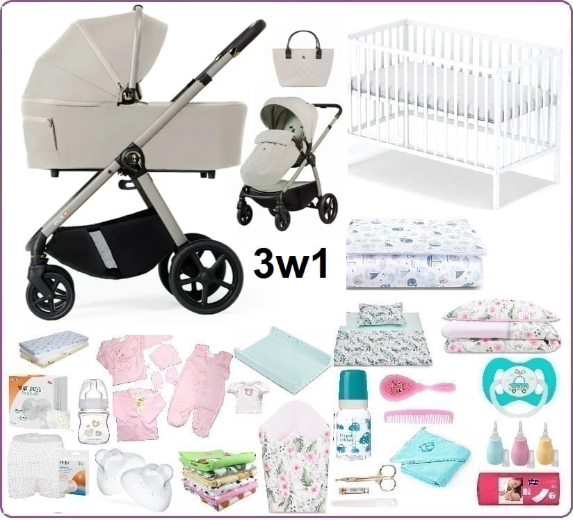 SKŁAD MEGA WYPRAWKI: ponad 50el (wózek 3w1, zestaw łóżeczkowy, akcesoria dla mamy i dziecka,ubranka)