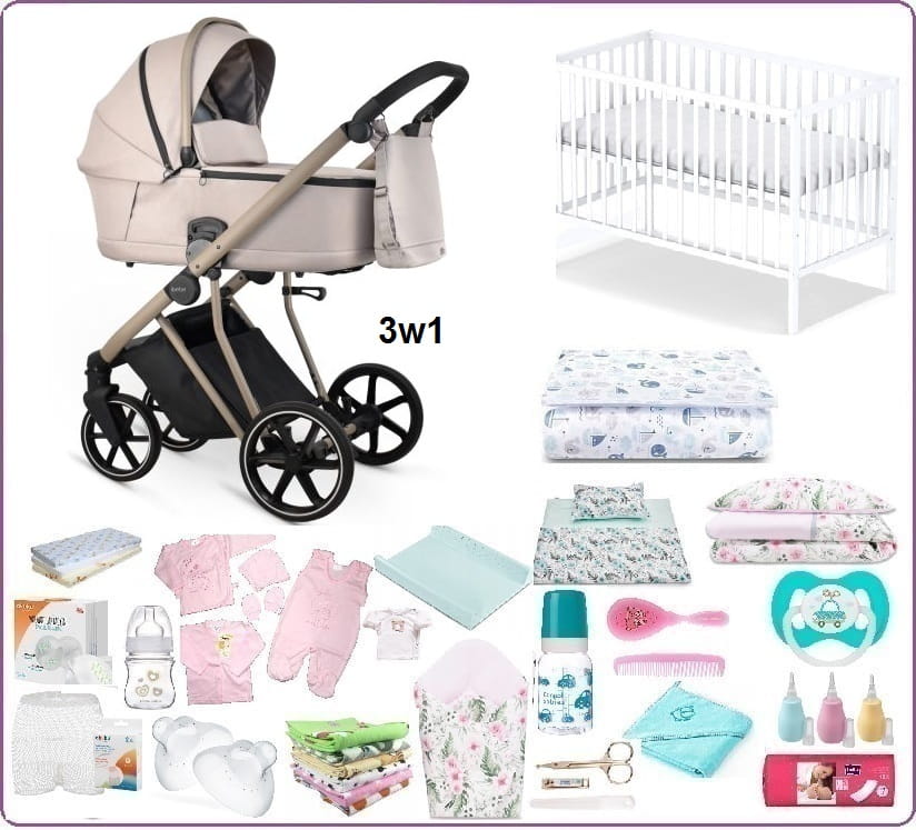 SKŁAD MEGA WYPRAWKI: ponad 50el (wózek 3w1, zestaw łóżeczkowy, akcesoria dla mamy i dziecka,ubranka)