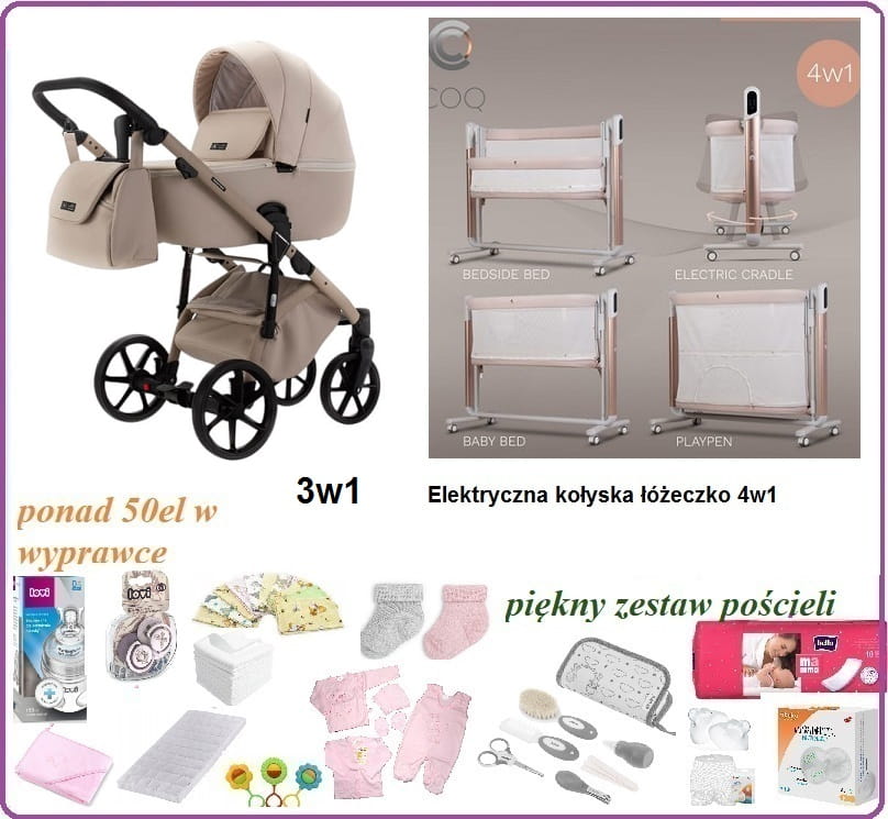 SKŁAD WYPRAWKI: ponad 50el (wózek 3w1, kołyska elektryczna, akcesoria dla mamy i dziecka,ubranka)