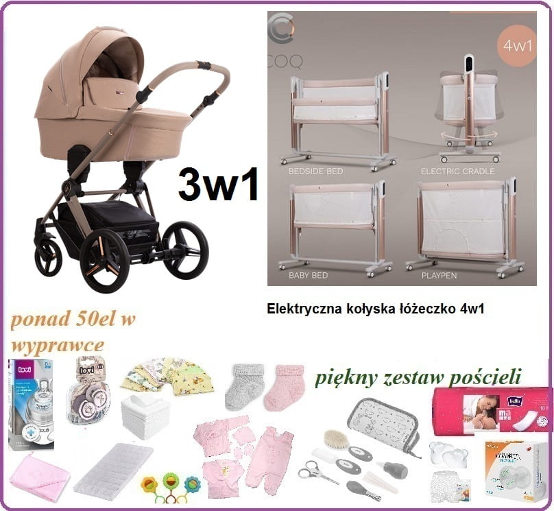 SKŁAD WYPRAWKI: ponad 50el (wózek 3w1, kołyska elektryczna, akcesoria dla mamy i dziecka,ubranka)