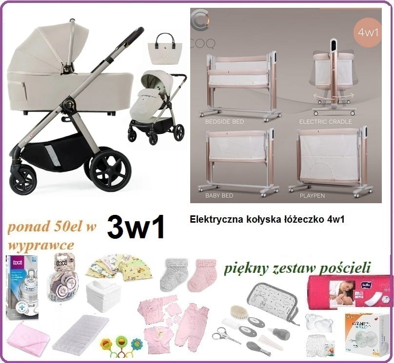 SKŁAD WYPRAWKI: ponad 50el (wózek 3w1, kołyska elektryczna, akcesoria dla mamy i dziecka,ubranka)