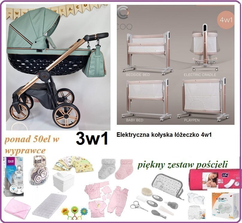 SKŁAD WYPRAWKI: ponad 50el (wózek 3w1, kołyska elektryczna, akcesoria dla mamy i dziecka,ubranka)